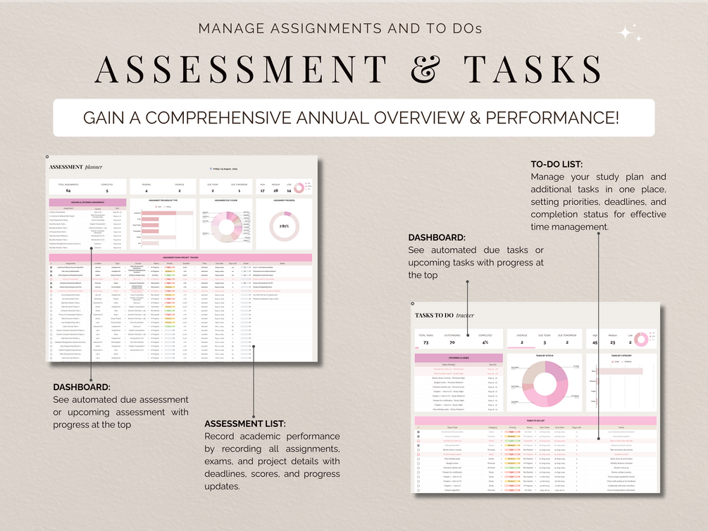 This fully customizable academic planner includes a comprehensive course planner, assignment tracker, homework tracker, assessment planner, and study log. Easily plan your semester with the school planner layout, manage your workload with the task tracker, and never miss a due date using the built-in college assignment and homework planner features.